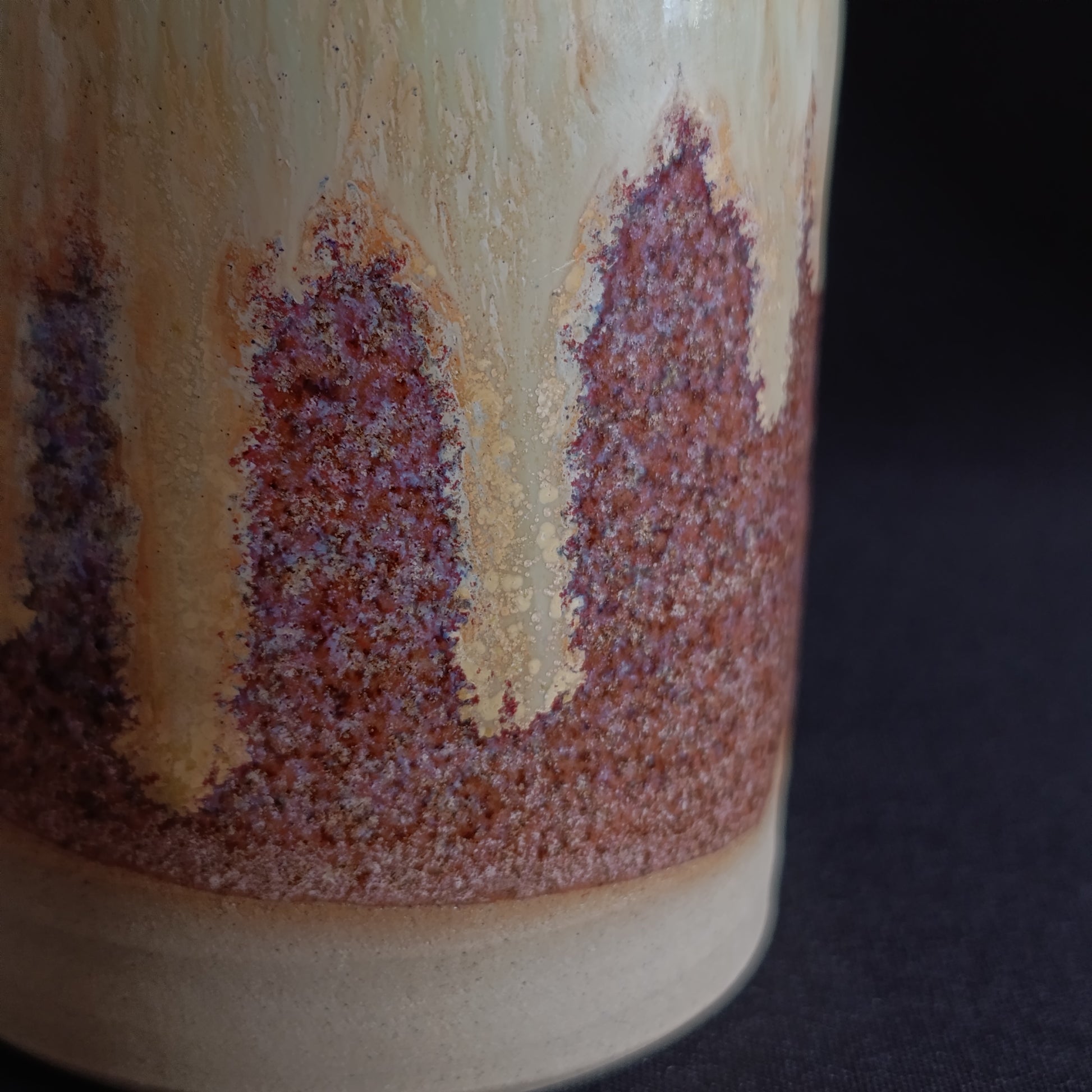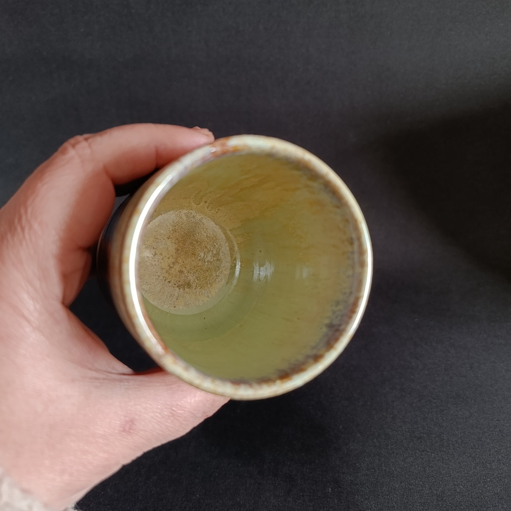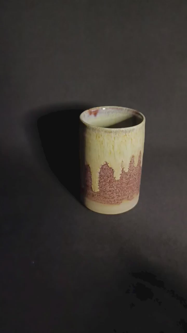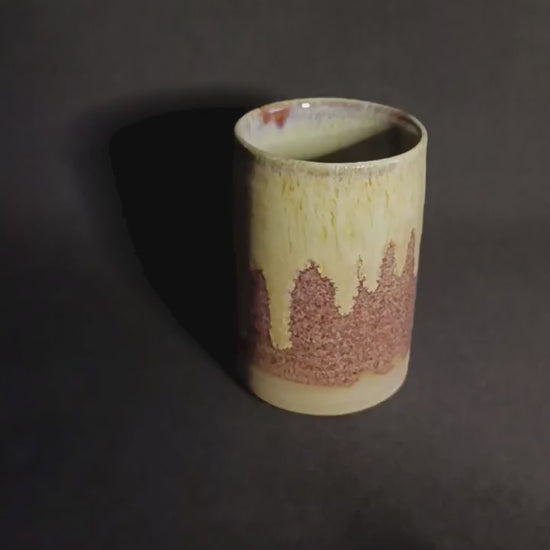 Bicchieri fatta a mano in gres sui toni di rosato e giallo-verde con sfumature particolari.